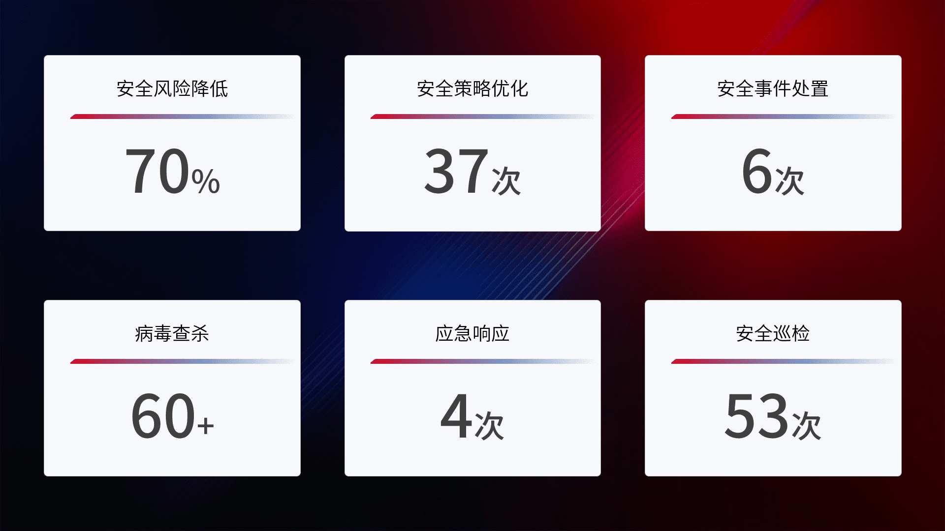 提供全面的安全事件报告体系,,,,包括处置报告、、、周报、、、季度和年度总结,,,结合持续监控,,帮助客户深入了解网络安全状况。。